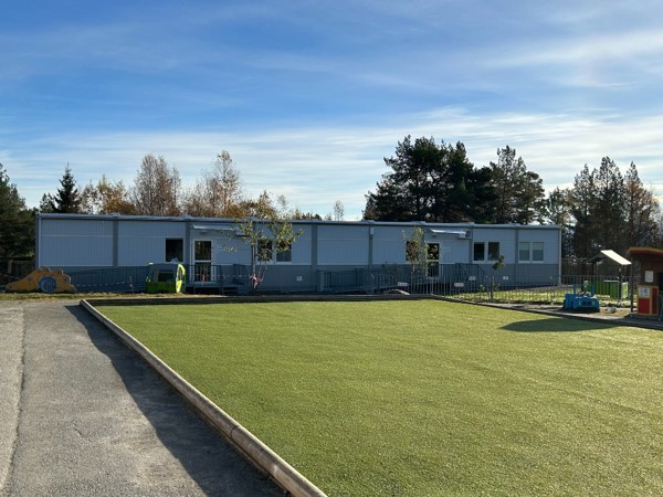 Høsten 2023 utvidet vi med 2 avdelinger. Vi har fått en paviljong mot øst på området vårt. Dette er midlertidig til nye Mobarn Øverland barnehage står ferdig.